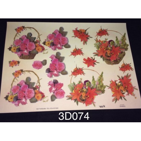 D Embossed / Gilded Decoupage sheet - Pink Red Flowers & Basket Flowers